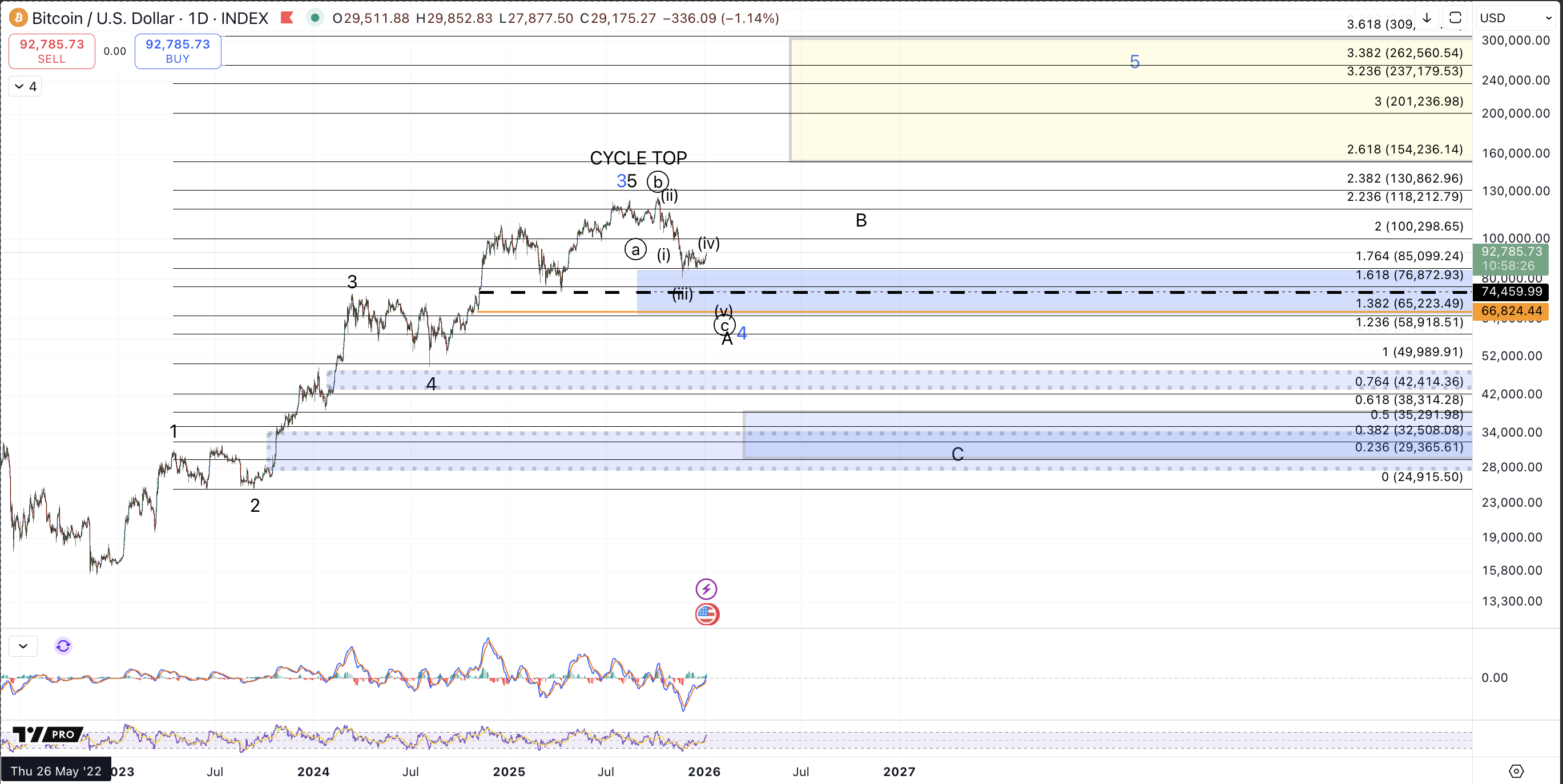 На микроуровне, пока цена остается ниже декабрьского максимума в 94,6 тыс. долларов, основной тезис заключается в том, что биткоин заполняет очень затяжной треугольник волны (iv), который в конечном итоге предполагает пробой ниже ноябрьского минимума для завершения нисходящей волны c от октябрьского исторического максимума. Ожидаемый пробой направлен на уровни 67-74 тыс. долларов. В идеале мы можем увидеть как минимум повторное тестирование апрельского минимума.
