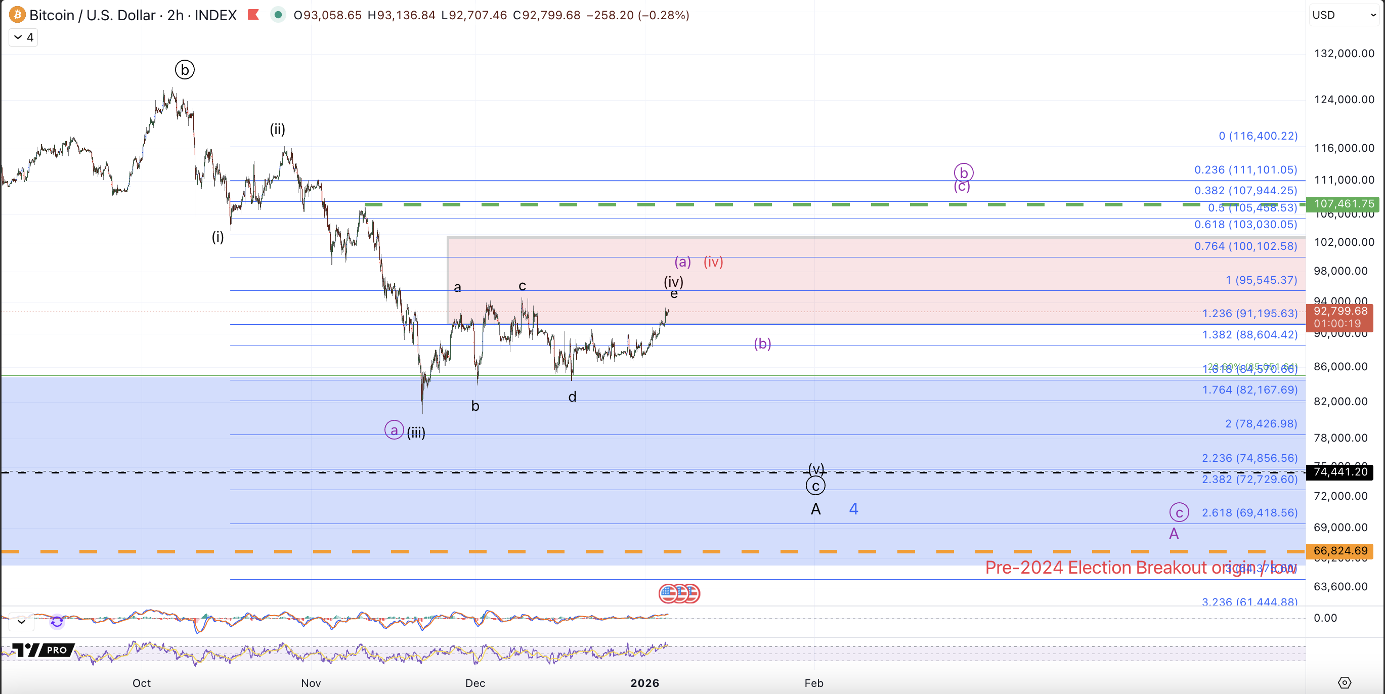 Что произойдет, если цена пробьет отметку в 95 000 долларов до пробития ноябрьского минимума? Хотя это технически опровергнет описанную выше операционную гипотезу, это не подразумевает явного бычьего тренда. Если этот небольшой рост продолжится в начале этой недели после декабрьского максимума, фиолетовый график на 2-часовом графике станет предпочтительной гипотезой и будет означать, что цена заполняет более крупную волну А, где отскок от ноябрьского минимума является начальным кругом А более широкой волны А. Сопротивление в этом случае находится в диапазоне от 107 500 до 111 000 долларов.